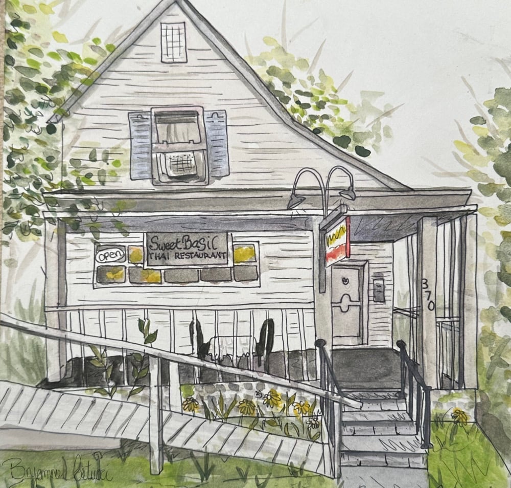 7.25x7.25 inch watercolor illustration of Sweet Basil Thai Restaurant in Albany, NY